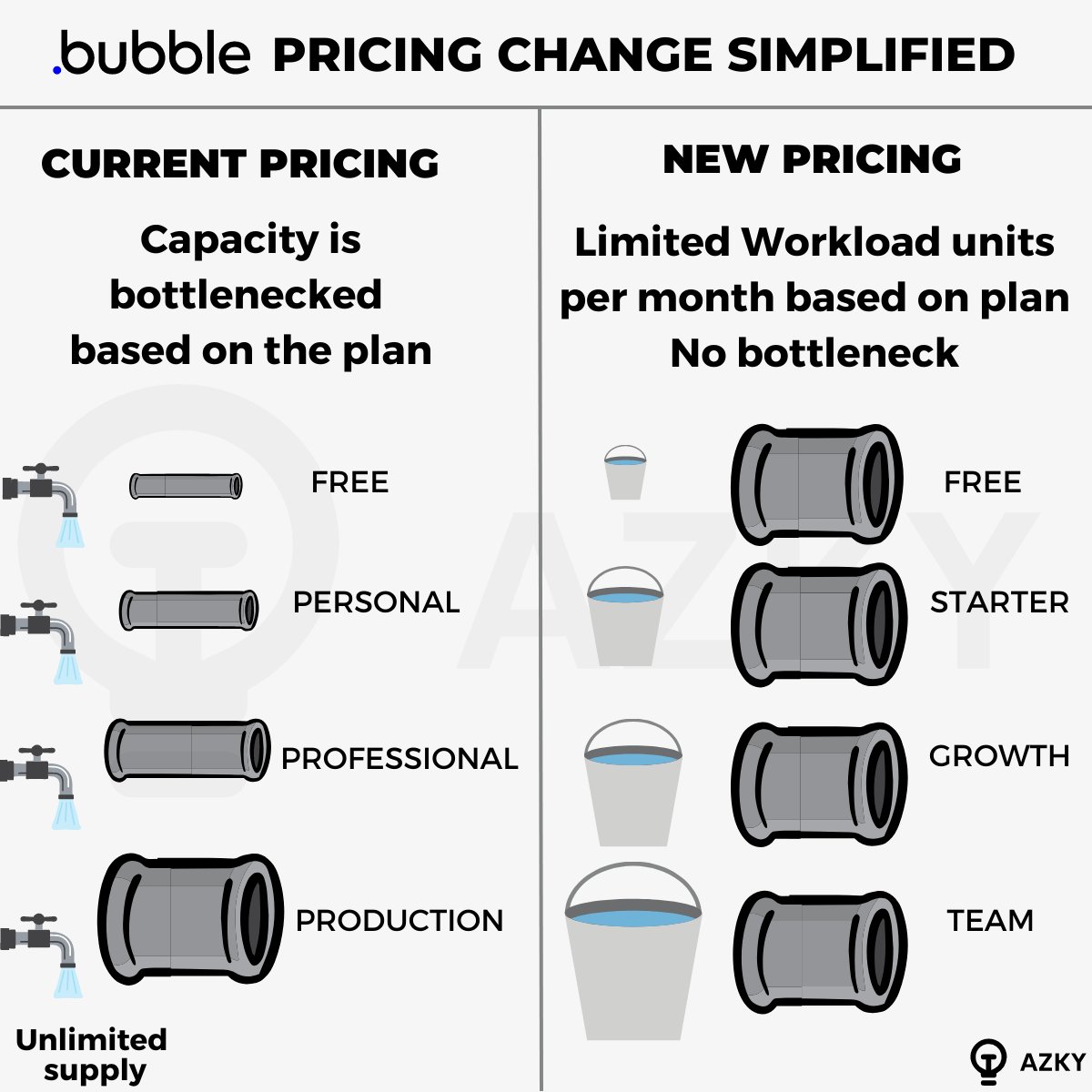 In the previous capacity model, we had an unlimited water supply but your app was connected using a thin pipe depending on which plan you were on. If you were on a personal plan, you get a thin pipe, if you need more water immediately for a traffic spike or you’ve got more users simultaneously, you had to upgrade to a bigger capacity plan or purchase more units of capacity however this model has it’s limitations over time you have unlimited water for the whole month, but if you had a thousand users come to your platform the pipe would limit total resources allocated to your app. So you get familiar oh.. Timed out, operation timed out, Bubble is slow or something.